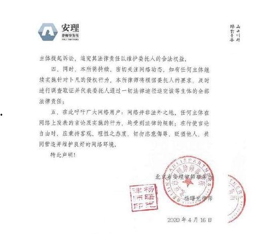 对于这起事件,法律界人士也纷纷发表了自己的观点。一位资深律师表示,律师函作为一种法律手段,具有一定的法律效力。但在这起事件中,明星团队的做法可能存在过度维权的情况。同时,律师还提醒广大网友,在遇到类似事件时,要理性看待,切勿盲目跟风。